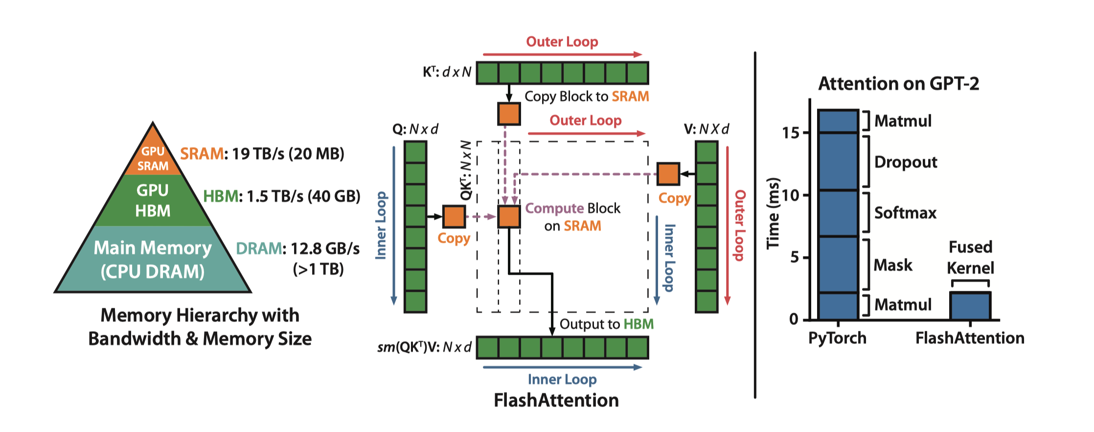 Description: Split the Q, K, V into blocks and calculate output matrice O by block to avoid the store of softmax intermediate matrice which has size of seq_len * seq_len in HBM memory, which reduce the memory-bound, as a result, required memeroy of attention is almost linearly with senquence length of sentence.