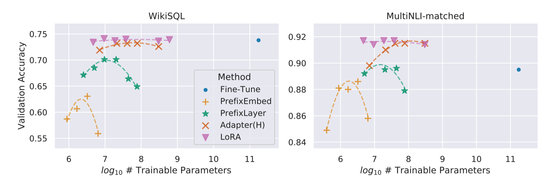 Description: Change small matrices A and B when fine-tune, adding A * B to weight W, which significantly reduce the trainable number of parameters because r << d